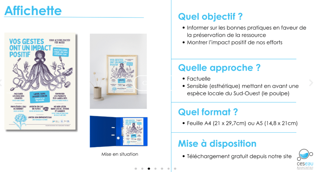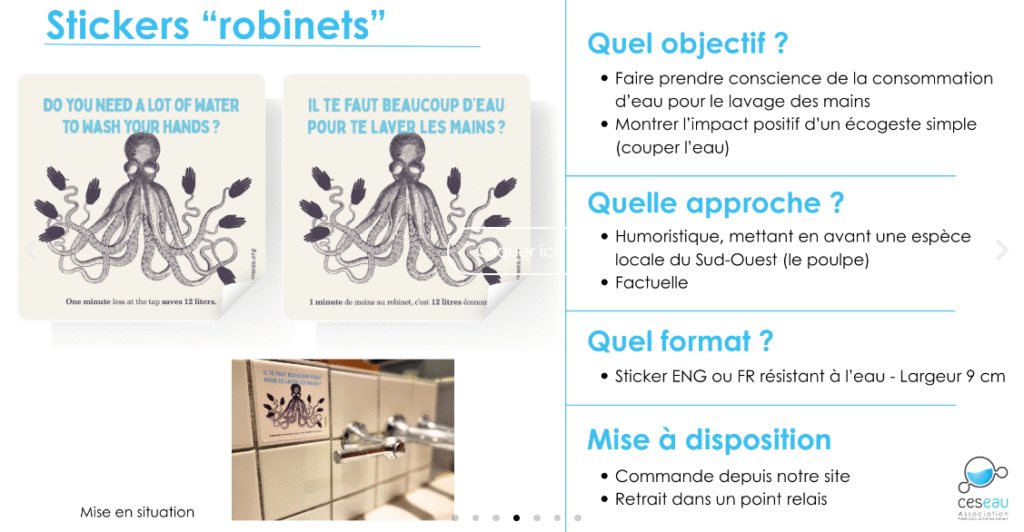 Bonne nouvelle : l’association Ceseau, avec le soutien de l’Agence de l’Eau Adour-Garonne, propose un outil clé en main pour vous accompagner : le Kit de sensibilisation aux écogestes.